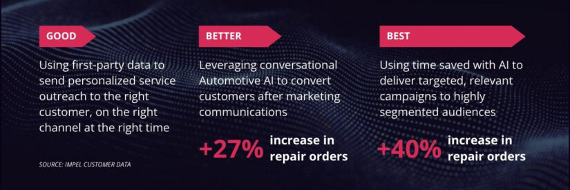 By replacing mass marketing with hyper-personalized and timely communications, dealerships can transform customer frustration into appreciation. When customers receive tailored notifications about upcoming service milestones, recalls, inspections, or relevant offers, delivered at the right place and time, they feel valued and understood. As a result, they’re far more likely to consistently choose the dealership over an independent repair shop. Personalized auto service AI communications are not only more effective in driving engagement, they reduce customer opt-outs by 4x compared to generic messaging (Source: Impel customer data).
